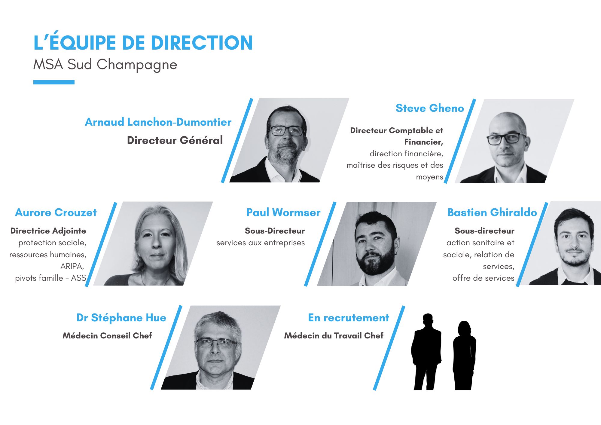 La direction de la MSA Sud Champagne est composée d'un directeur général, d'une directrice adjointe et de plusieurs sous-directeurs.